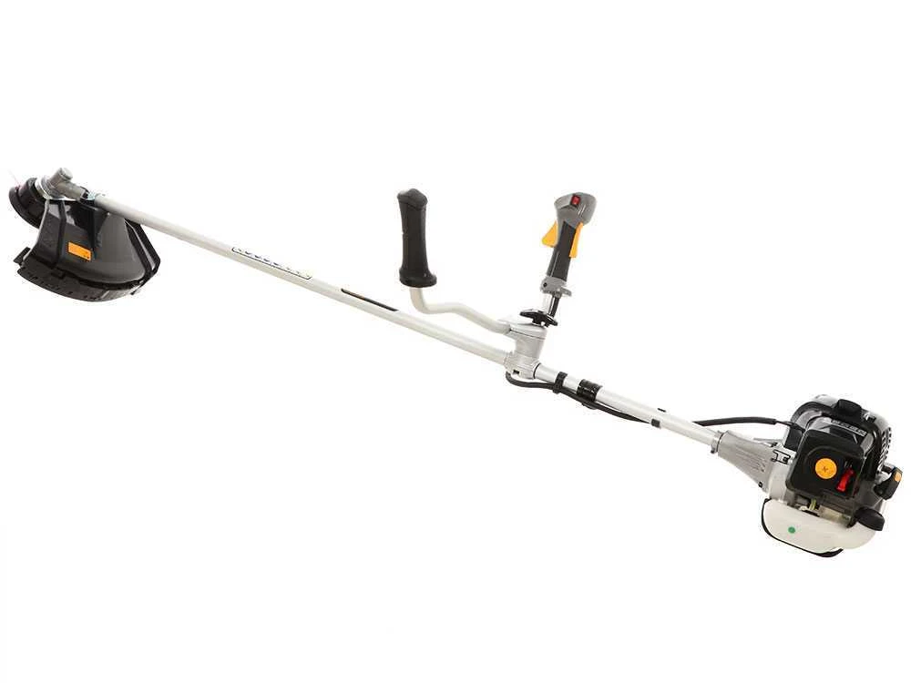 Il ha una doppia maniglia ergonomica che assicura il controllo del decespugliatore in ogni condizione. Questo prodotto è dotato anche di un cinghione di sostegno con riparo coscia, una testina tap&go con filo da 2,8 mm e disco a 3 denti.