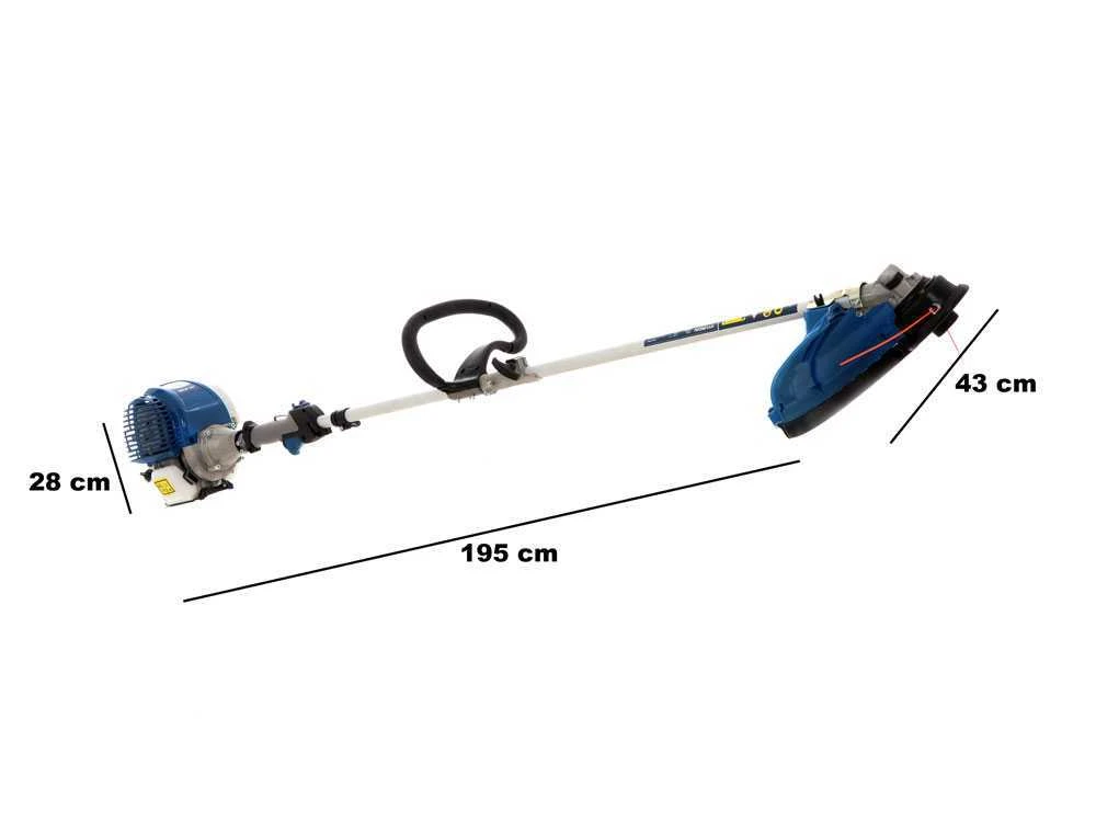 L’asta del decespugliatore è lunga 150 cm e ha un diametro di 26mm. L’impugnatura grip ergonomica contiene tutti i comandi necessari al suo funzionamento. Monta un robusto alberino interno di trasmissione millerighe da 7mm e 9 punte.