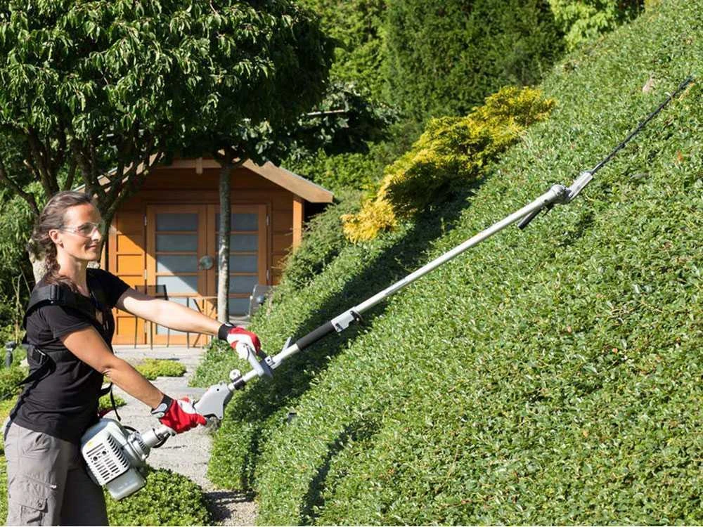 Questo decespugliatore, grazie all’impugnatura singola e al leggero motore, può essere usato anche in situazioni scomode.