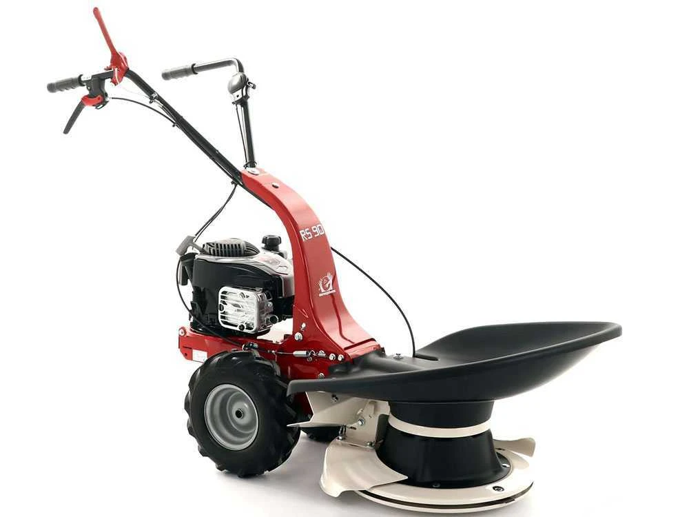 La è una falciatrice rotativa con motore a scoppio a benzina trazionata dotata di ruote pneumatiche scolpite comandate da una trasmissione a vite senza fine in bagno d’olio. La sua (compresa nel prezzo d’inserzione) è composta da un disco rotante dotato di ben 4 lame rotanti sul loro asse a scomparsa (le lame rientrano all’interno della scocca) in caso di urto.