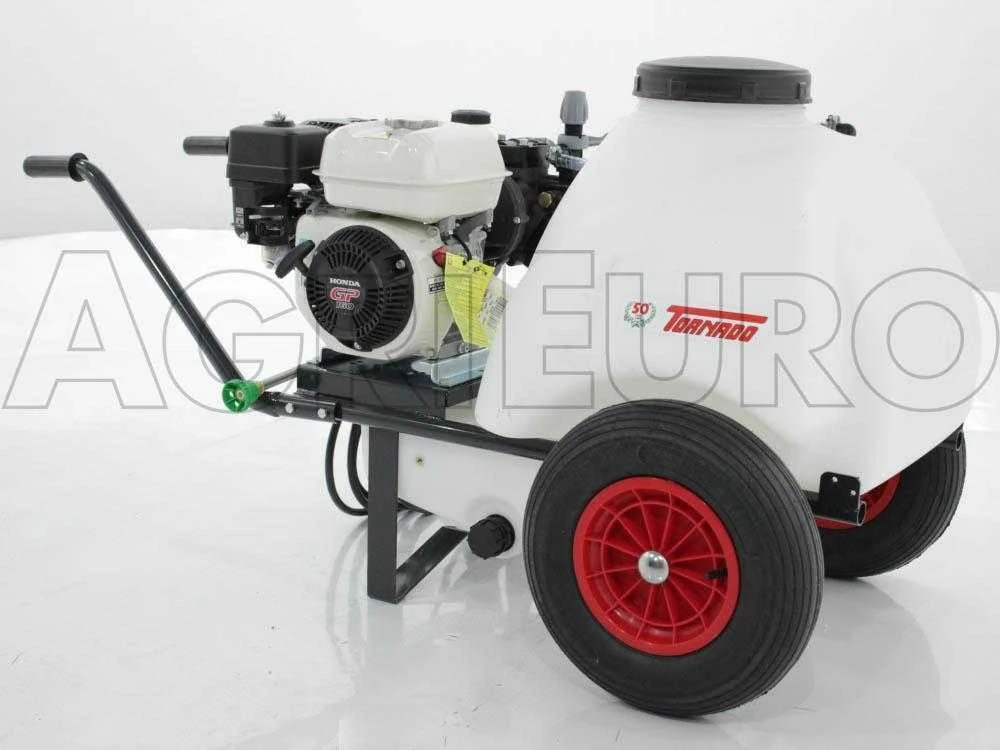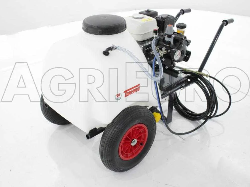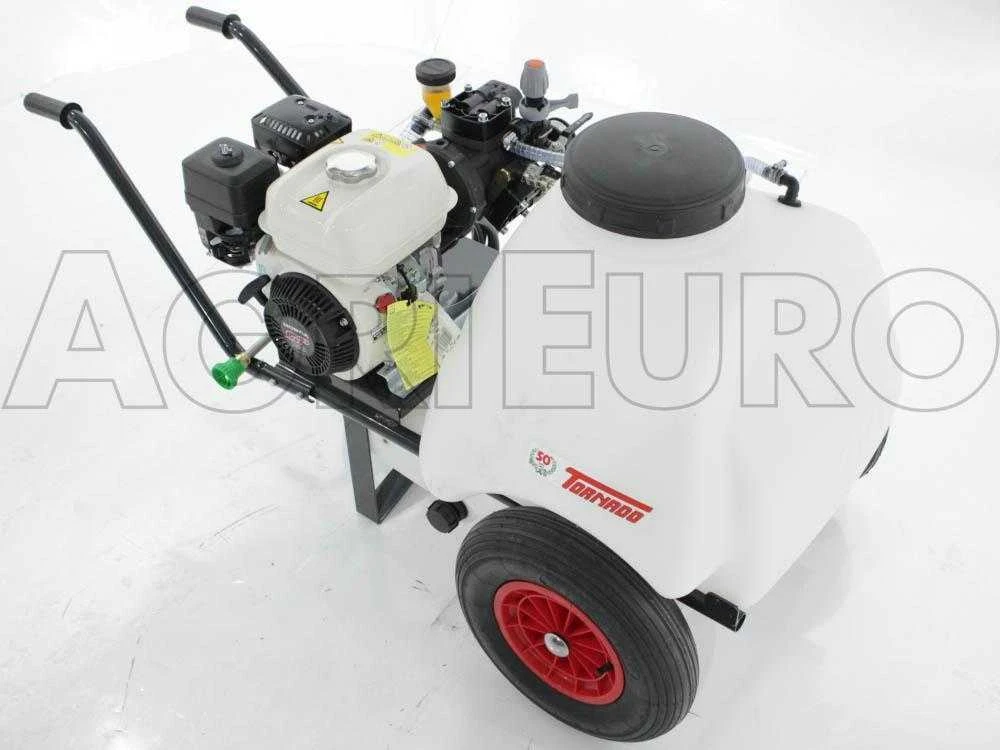Carrello con 2 ruote pneumatiche di grandi dimensioni. Cisterna da 120 lt in polietilene con filtro di aspirazione esterna.