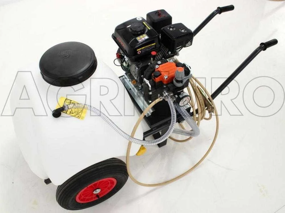 Carrello con 2 ruote pneumatiche di grandi dimensioni. Cisterna da 120 lt in polietilene con filtro di aspirazione esterna.