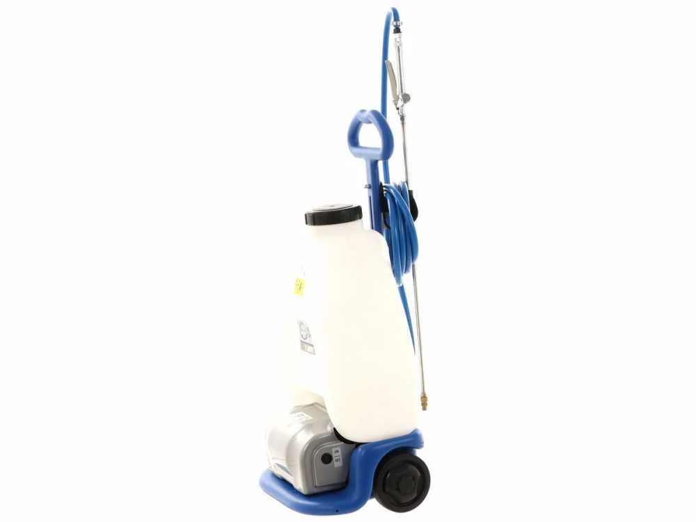 La praticità di trasporto è garantita grazie alle due ruote anteriori e alla pratica maniglia che permettono di muovere la macchina in qualsiasi ambiente di lavoro. Oltre a ciò, è presente anche un comodo porta tubo e un porta lancia.
